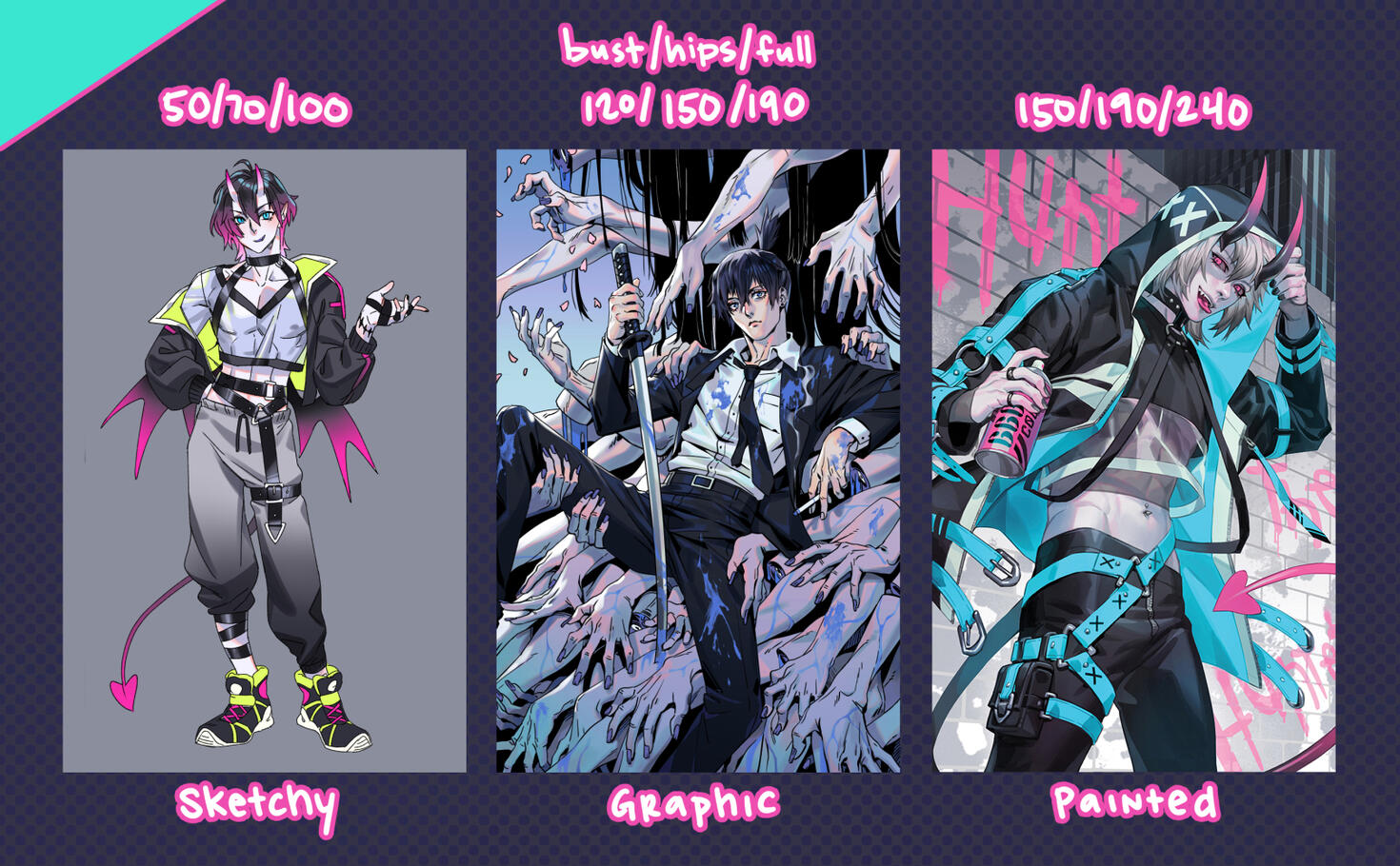 *All prices are in USD. Must provide pics/refs for OCs or MMO character (quick doodles and screenshots ok!) Pose+color scheme refs always appreciated, again even if it's a little scribble you did it helps us both a lot!